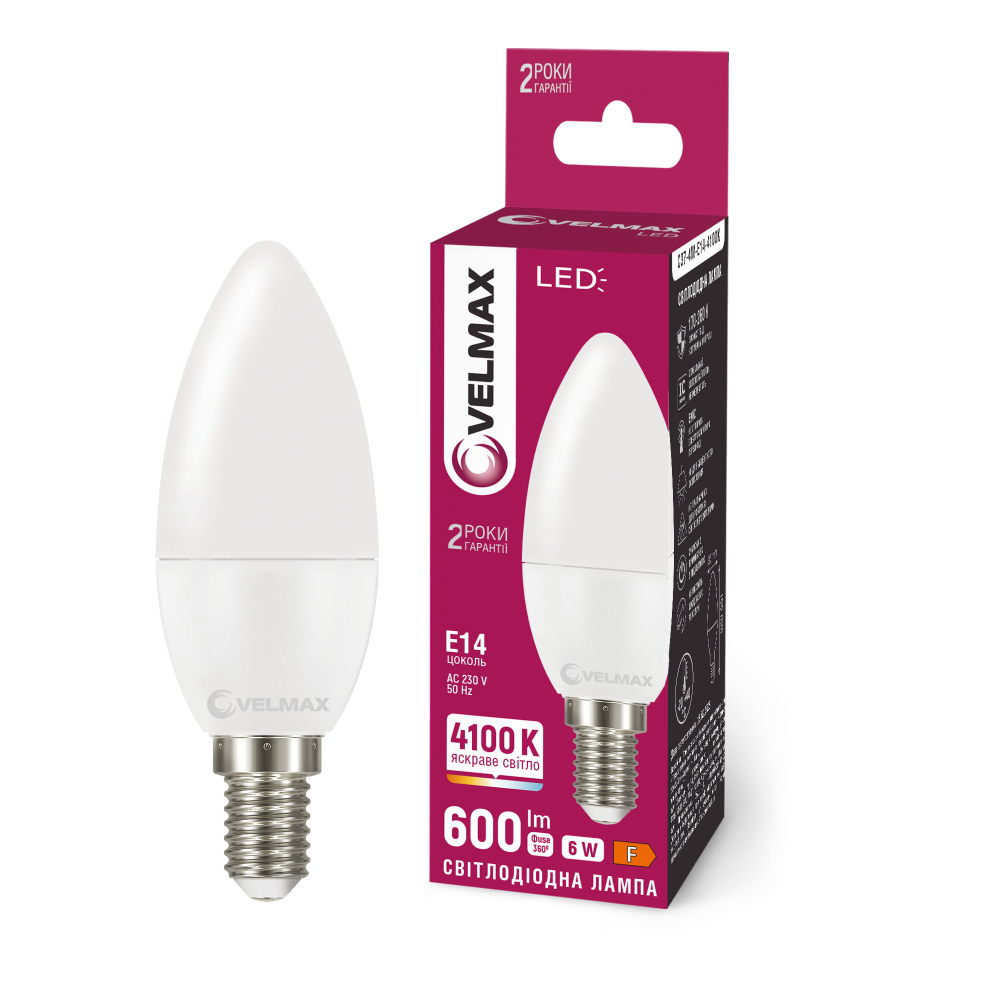 LED лампа VELMAX V-C37-61441, 6W, E14, 4100K, 230V
