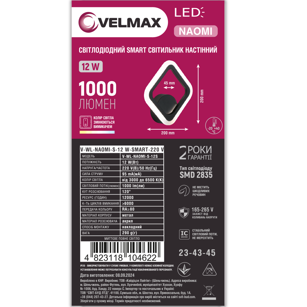 LED світильник VELMAX V-WL-NAOMI-S, 12W, 3000K-6500K, 1000Lm