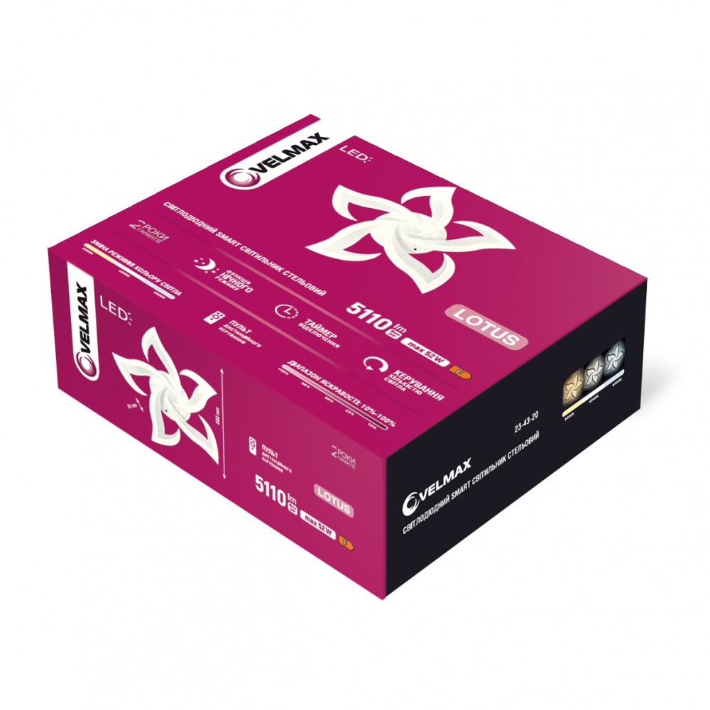 LED світильник VELMAX V-CL-LOTUS-5Wh, max 52W, 3000K-6500K, пульт, блок живлення, білий, 230V