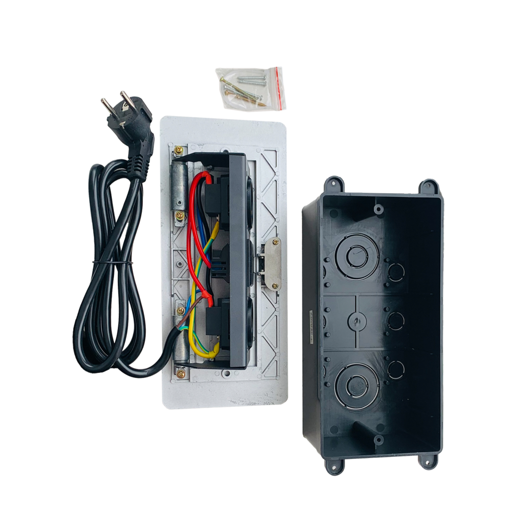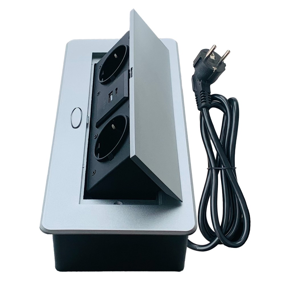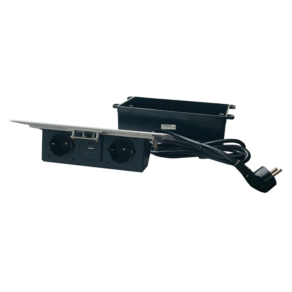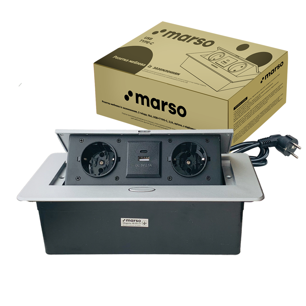 Розетка меблева з кабелем 1.5м, з/з, 2 гнізда, 16А, USB+TYPE-C, 2,1А, врізна, срібло, MARSO