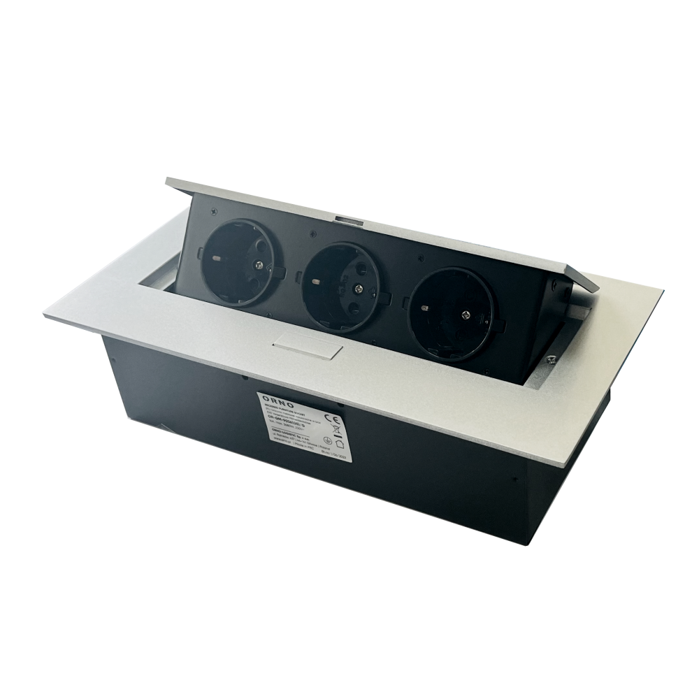 Розетка меблева з/з, 3 гнізда, 16А, врізна, з підйомною кришкою, метал, срібло, ORNO (OR-GM-9036(GS)/G)